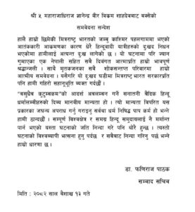 समवेदना सन्देशमा भनिएको छ,‘बसुधैव कुटुम्बकमको आदर्श अवलम्बन गर्ने सनातनी वैदिक हिन्दू धर्मावलम्बीको दिव्य मानवीय मान्यता हो। त्यो मान्यता विपरीत यस प्रकारका जघन्य अपराध गर्नु गराइनु सर्वथा धर्म निषिद्ध पाप कर्म हो भन्ने हामी ठान्दछौं। सम्पूर्ण विश्व क्षेत्र र समग्र हिन्दू समुदायलाई नै मर्मान्त पार्न भएको यस्ता घटनाको जति निन्दा गरे पनि थोरै हुन्छ। त्यस्तो घटनाको विश्वव्यापी भर्त्सना हुनु पर्दछ र सबैबाट निन्दा गरिनु पर्छ भन्ने हाम्रो धारणा छ।’