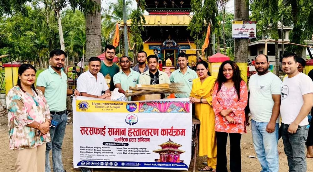 वीरगंज, १३ साउन । लायन्स क्लब अफ वीरगंज परिवारले मंगलवार पशुपतिनाथ मन्दिर परिसरमा सरसफाइ सामग्री हस्तान्तरण गरेको छ । लायन्स क्लब अफ वीरगंज कुटुम्ब, एक्सिलेन्स, फ्रेन्डजोन, सर्वाेत्तम र सहयोगीले “प्लास्टिक झोला प्रयोग नगरौं”, “म मन्दिर फोहर गर्दिन” नारासहित प्लास्टिक मुक्त र सफा वातावरणवारे जनचेतना फैलाउने उद्देश्यले सामग्री वितरण गरिएको हो । कार्यक्रमका क्लबका अध्यक्ष नरोत्तम पाण्डे, बासु तिमल्सिना, कविता खड्का, श्याम गुप्तालगायतको सहभागिता थियो ।