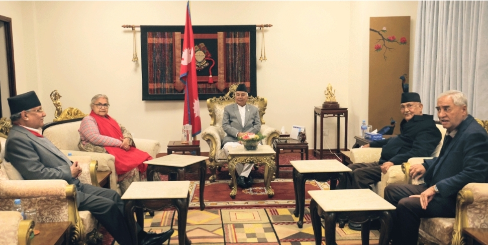 जेन जेड आन्दोलनपछि तीनवटै दलका शीर्ष नेतासँग राष्ट्रपति र पौडेलले गरेको यो पहिलो छलफल हो ।