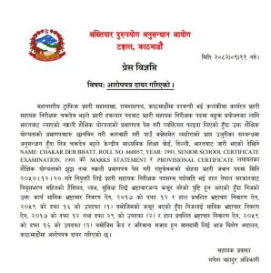 अख्तियार दुरुपयोग अनुसन्धान आयोगले महानगरीय ट्राफिक प्रहरी महाशाखा, रामशाहपथ, काठमाडौँमा कार्यरत तत्कालीन प्रहरी सहायक निरीक्षक चक्रदेव भट्टविरुद्ध शैक्षिक योग्यताको नक्कली प्रमाणपत्र सम्बन्धी आरोपमा मुद्दा दायर गरेको हो ।भट्टले प्रहरीमा प्रवेश गर्दा शैक्षिक प्रमाणपत्र केन्द्रीय माध्यमिक शिक्षा बोर्ड दिल्ली भारतबाट जारी भएका कागजात पेस गरेका थिए।