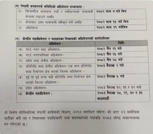 पुस २६-२८ सम्मको महाधिवेशन तालिका प्रभावित भएसँगै महामन्त्रीद्वय गगनकुमार थापा र विश्वप्रकाश शर्माले विशेष महाधिवेशनको मिति घोषणा गरेका थिए। यसरी पार्टी महाधिवेशनका विषयमा नेताहरू विभाजित हुँदा समस्याको हल खोज्न आज बसेको केन्द्रीय कार्यसम्पादन समितिको बैठकले नयाँ मिति पारित गरेको हो।