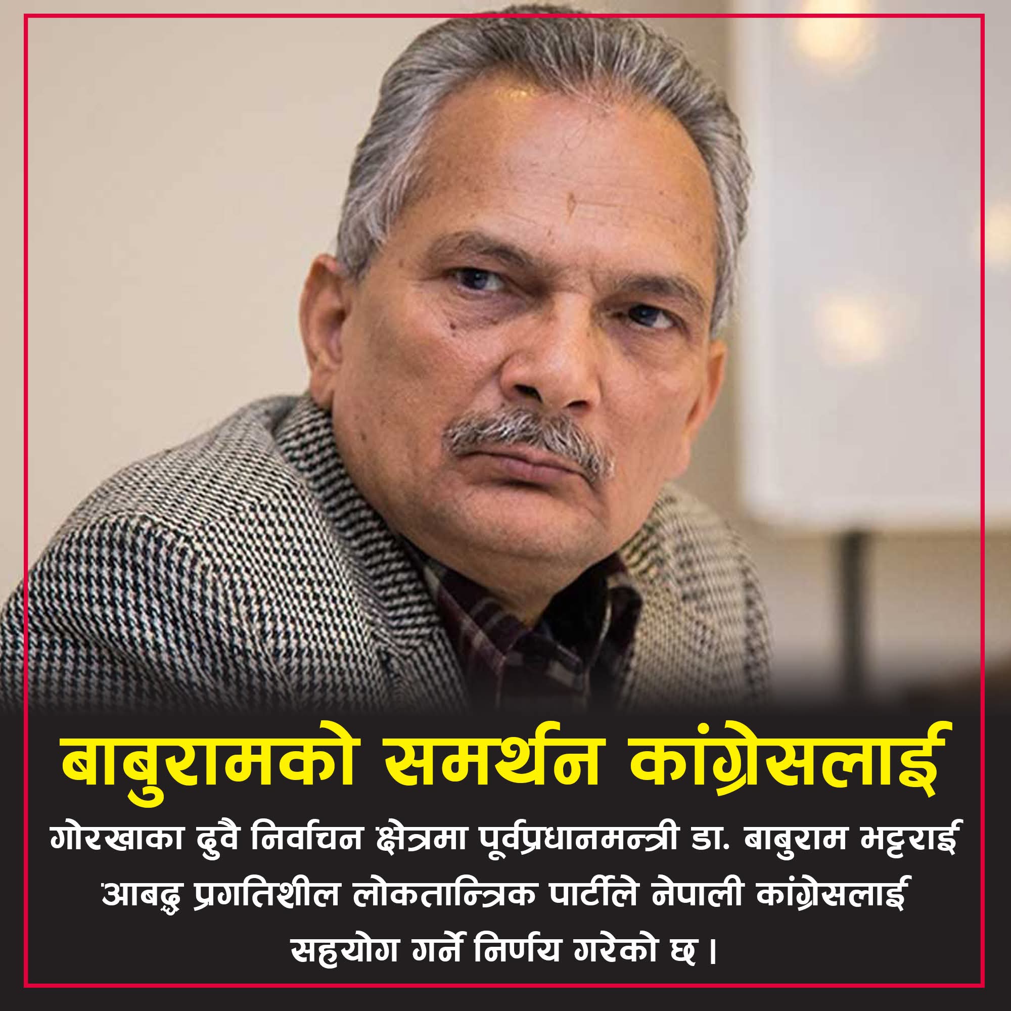 काठमाडौँ, १६ फागुन। पूर्वप्रधानमन्त्री डा. बाबुराम भट्टराई नेतृत्वको प्रगतिशील लोकतान्त्रिक पार्टी (प्रलोपा)ले गोरखाका दुवै निर्वाचन क्षेत्रमा नेपाली कांग्रेसका उम्मेदवारलाई सहयोग गर्ने निर्णय गरेको छ।