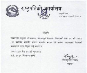 काठमाडौं। राष्ट्रपति रामचन्द्र पौडेलले राष्ट्रिय स्वतन्त्र पार्टी (रास्वपा)का वरिष्ठ नेता बालेन्द्र शाहलाई प्रधामन्त्री पदमा नियुक्त गरेका छन्।