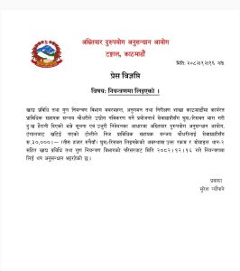 सोमबार अख्तियार दुरुपयोग अनुसन्धान आयोगले खाद्य प्रविधि तथा गुण नियन्त्रण विभाग, बबरमहलमा कार्यरत प्राविधिक सहायक सञ्जय चौधरीलाई ३० हजार रुपैयाँ घुस लिँदै गर्दा पक्राउ गरेको हो ।