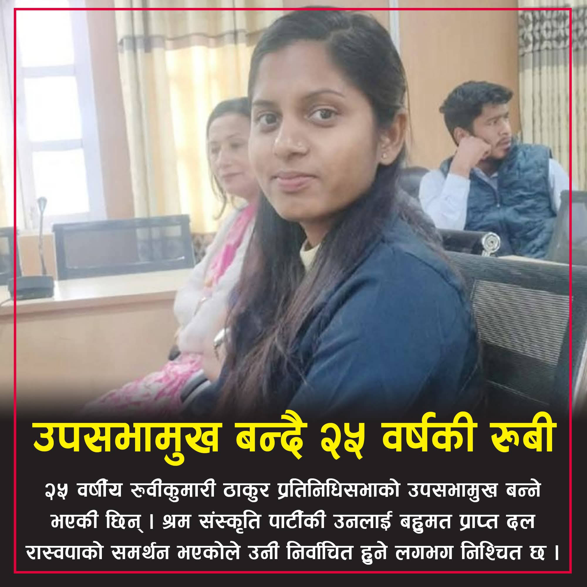 काठमाडौं । २५ वर्षीय रुवीकुमारी ठाकुर प्रतिनिधिसभाको उपसभामुख बन्ने भएकी छिन् । श्रम संस्कृति पार्टीकी उनलाई बहुमत प्राप्त दल रास्वपाको समर्थन भएकोले उनी निर्वाचित हुने लगभग निश्चित छ ।