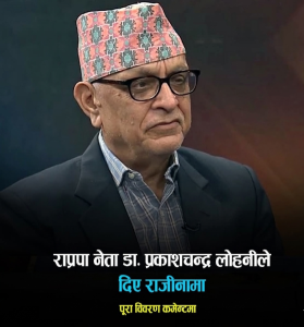 काठमाडौं : राष्ट्रिय प्रजातन्त्र पार्टी (राप्रपा) का नेता डा. प्रकाशचन्द्र लोहनीले पार्टीको निर्देशक समितिको अध्यक्ष पदबाट राजीनामा दिएका छन् ।